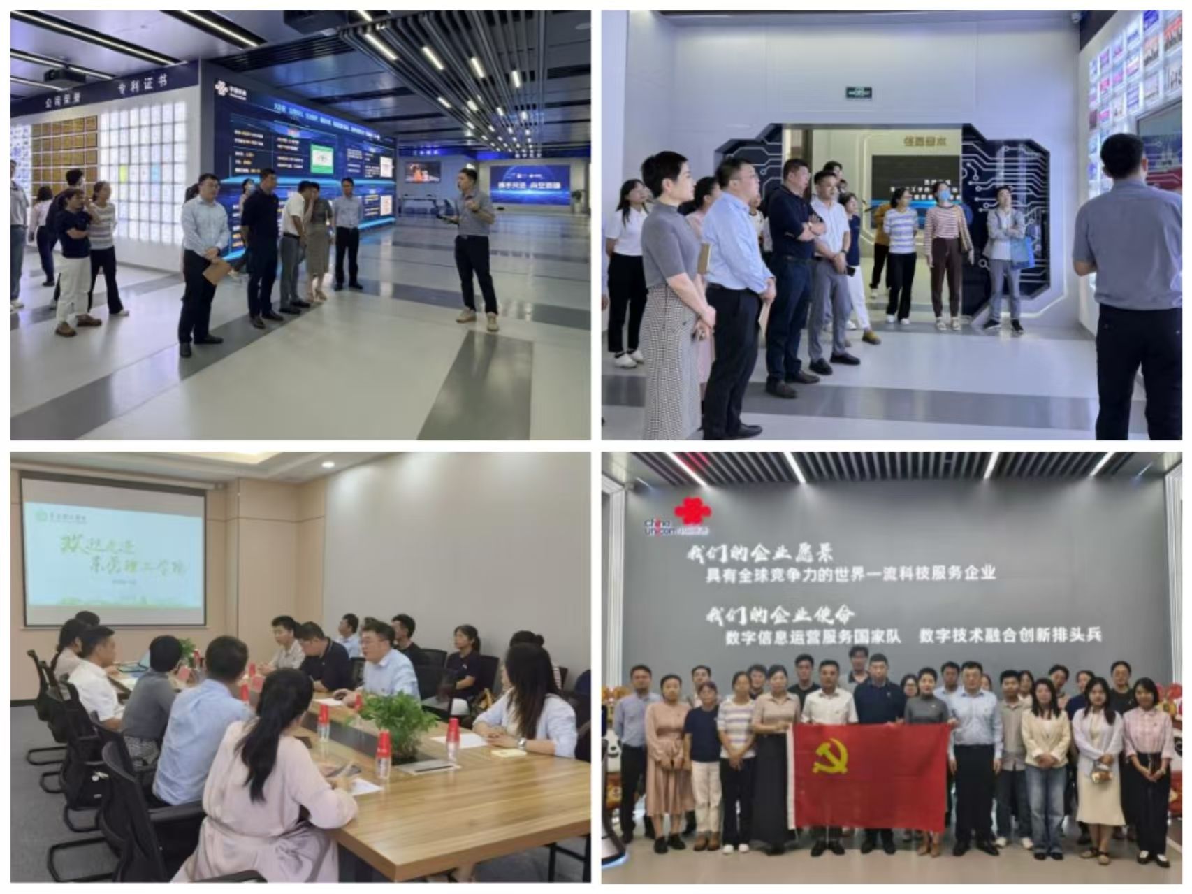 座谈交流环节,双方围绕党建工作经验分享、数据与业务融合等主题进行深入交流研讨,并就如何以党建引领校企合作、推动党建与业务互融互促展开热烈讨论。随后,双方党员共同参观了东莞联通数字化创新展览中心,直观感受数字技术创新理念,实地观摩其应用成果及行业实践案例,深入了解数字技术如何与产业融合赋能发展,为下来校企深化合作提供了思路与借鉴。