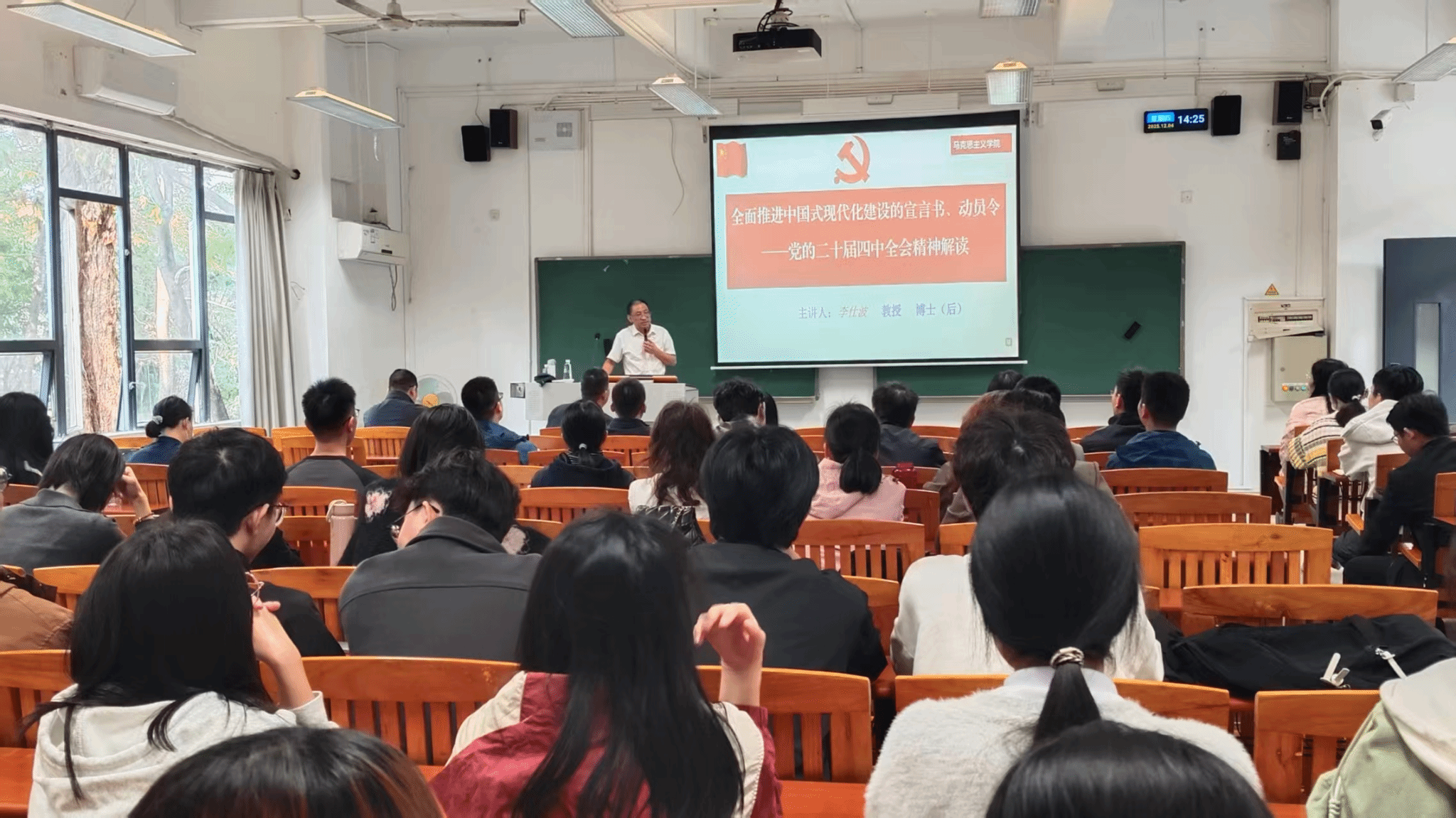 为深入学习领会党的二十届四中全会精神,切实把全院师生的思想和行动统一到党中央决策部署上来,12月4日,304永利集团在6C101举行学习贯彻党的二十届四中全会精神宣讲报告会。报告会由公司党委书记谢炯标主持,特邀马克思主义公司李仕波教授作专题报告。公司教职工、员工党员及各班级团支部书记参加学习。
