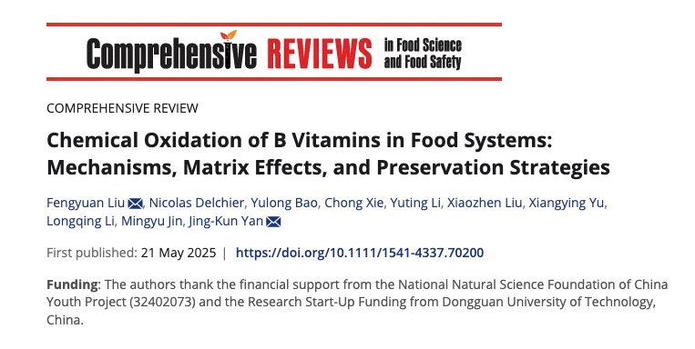 2025年5月,公司刘丰源博士在国际食品顶级期刊《Comprehensive Review of Food Science and Food Safety》在线发表题为“Chemical Oxidation of B Vitamins in Food Systems: Mechanisms, Matrix Effects, and Preservation Strategies”综述文章。刘丰源助理研究员为论文的第一作者,闫景坤教授为通讯作者。