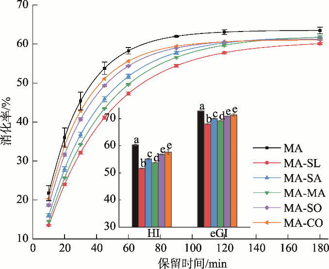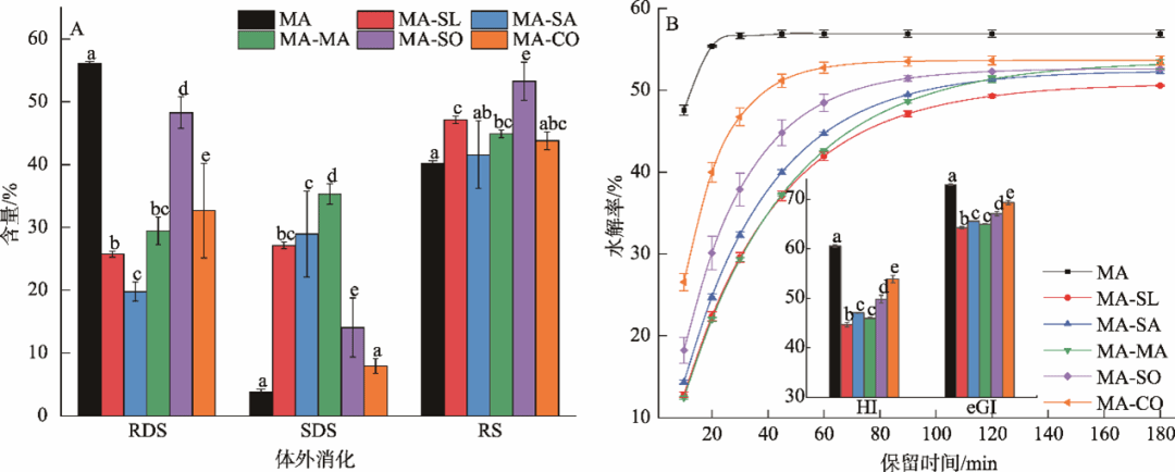 图1 淀粉-脂质复合物的体外消化性与水解率曲线(n=4)