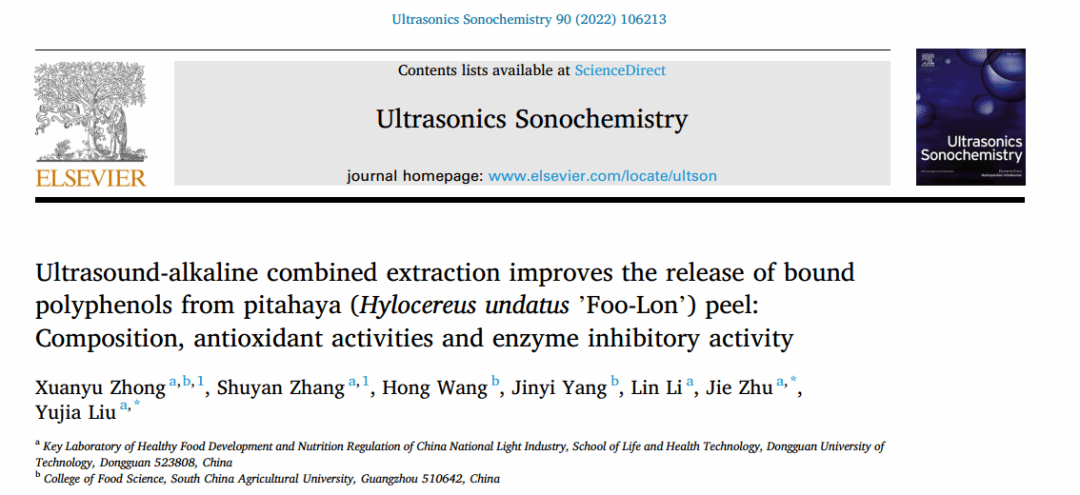 本研究以《Ultrasound-alkaline combined extraction improves the release of bound polyphenols from pitahaya (Hylocereus undatus ’Foo-Lon’) peel: Composition, antioxidant activities and enzyme inhibitory activity》为题发表在SCI收录期刊《Ultrasonics Sonochemistry》(IF2021= 9.34,1区TOP)。304永利集团官网-华南农业大学联合培养在读硕士钟烜钰为本文第一作者,该论文是公司304永利集团与联合高校共同培养硕士研究生积累的又一新成果。