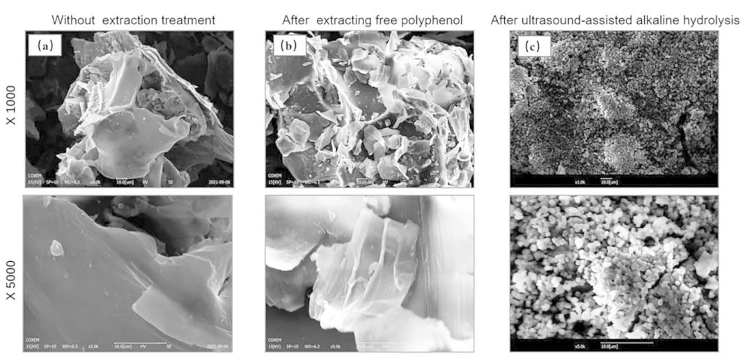 本研究采用超声波辅助碱水解法提取了火龙果皮中的结合多酚。实验优化了提取工艺;通过UPLC-QTOF-MS/MS方法分析了酚类化合物的种类和含量,及其与抗氧化活性之间存在的相互关系;扫描电镜结果显示,超声辅助碱水解法对细胞壁的破坏和结合多酚的释放至关重要。研究表明,超声波辅助碱水解法可以作为果皮结合酚释放的一种高效途径,本研究为进一步深入优化植物基结合多酚的分离和提取工艺及其为特膳食品的开发与应用提供新思路。