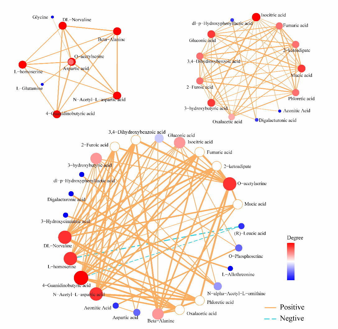 本研究揭示了重要的代谢生物标志物,包括 N-乙酰天冬氨酸、β-丙氨酸和 O-乙酰丝氨酸。这些标记物参与了水开菲尔发酵过程中的各种代谢途径,如丙氨酸、天门冬氨酸和谷氨酸代谢以及半胱氨酸和蛋氨酸代谢。本研究中的一个重要发现是绝大部分氨基酸和有机酸在相关网络中呈显著正相关,这表明这些基本成分之间存在协同增效关系,促进了相互作用。此外,这项研究还描述了水开菲尔发酵过程的详细代谢网络,为进一步探索水开菲尔发酵的复杂代谢机制奠定了坚实的基础。