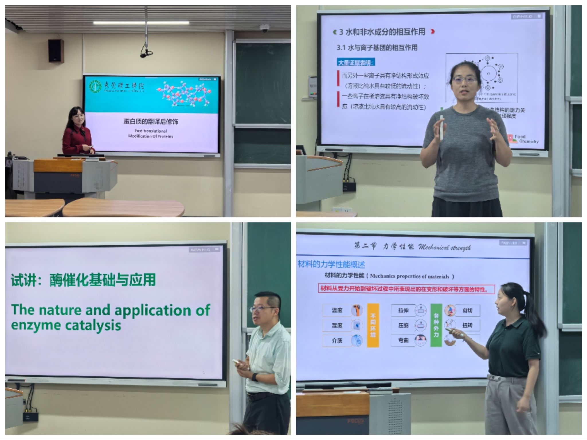 试讲环节中,王梅梅、李玉婷、杨键、王韫四位教师依次登台展示。王梅梅聚焦生物学领域,围绕蛋白质翻译后修饰的具体类型展开讲解;李玉婷以化学知识点为核心,结合化学成分原理与实际生活场景,清晰阐述水与非水成分的反应规律及物质性质;杨键专注于酶相关专业内容,从酶的结构特点、催化机制到实际应用场景,层层递进剖析知识点;王韫则围绕力学领域基础理论,通过公式推导、实例分析等方式,讲解力学原理在生活中的应用。与会人员从教学目标达成、授课重难点突破、课堂互动设计合理性等维度试讲教师进行细致点评,既分别肯定了各位教师的授课亮点,也依次提出了针对性改进建议。