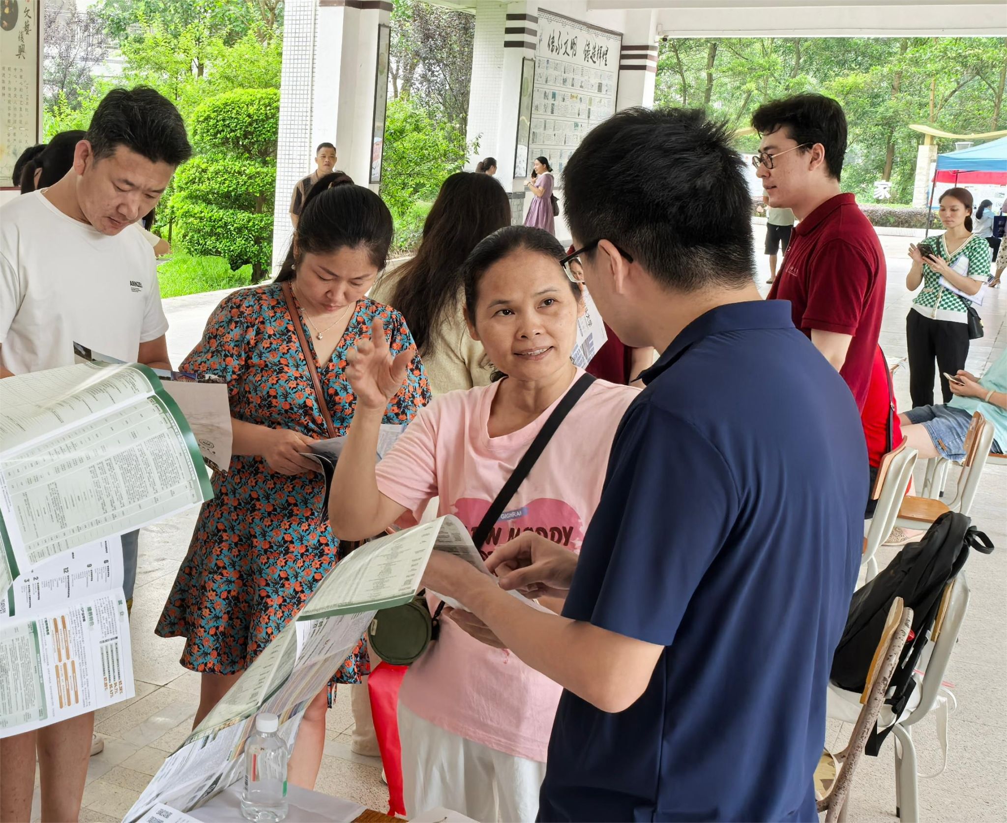 咨询会当天是广东省高考成绩放榜第二天,现场热闹非凡,前来咨询的家长和考生络绎不绝。谢炯标带领公司招生团队详细介绍了公司的办学特色、专业设置、团队力量以及就业前景等方面情况,耐心解答了家长和考生们的疑问。老师们以丰富的专业知识和教学经验,为考生们详细解读了各专业的课程设置和未来发展方向,让参会考生对大学的专业选择有了更清晰的认识。此外,他们还就公司实践教学、科研条件和项目合作等进行了详细介绍,让考生们对老员工的在校实习实践和科研活动有了更直观的了解。整个招生咨询会过程中,公司招生队伍始终以热情、专业的态度为家长和员工提供咨询服务,赢得了一致好评。